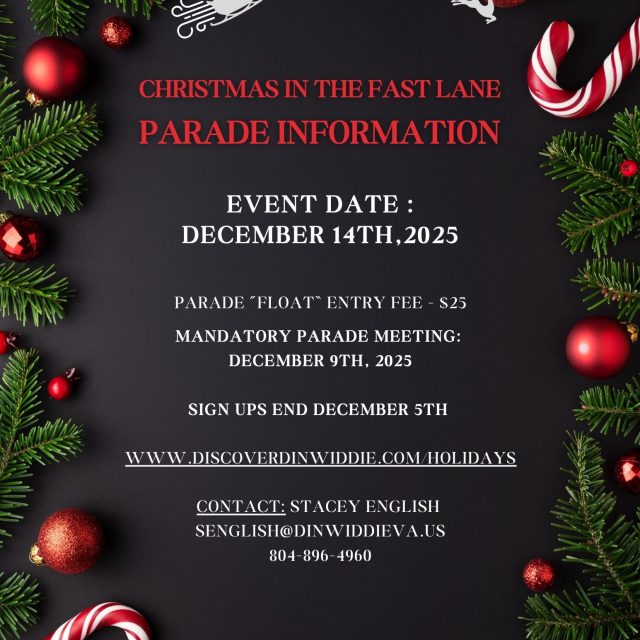 Registration is open for parade entries and tree-decorating contestants. Our theme, “Christmas in the Fast Lane,” reflects Dinwiddie’s blend of rural hospitality and high-energy motorsports culture.